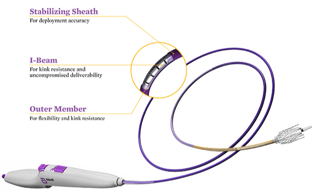 Triašė technologija, skirta absorbuoti kaupiamą energiją ir sumažinti trintį dislokavimo metu, kad būtų užtikrintas tikslus stento įdėjimas.