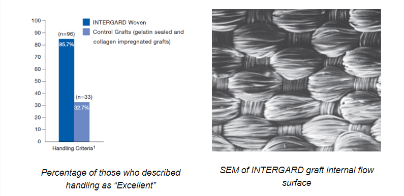 INTERGARD protezų išorinio sluoksnio tekstūra leidžia saugiai prisitvirtinti aplinkiniams audiniams gijimo metu. Kai tuo tarpu vidinis sluoksnis tolygus ir glotnus, kas apsaugo nuo pseudointimos formavimosi ir trombų susidarymo.